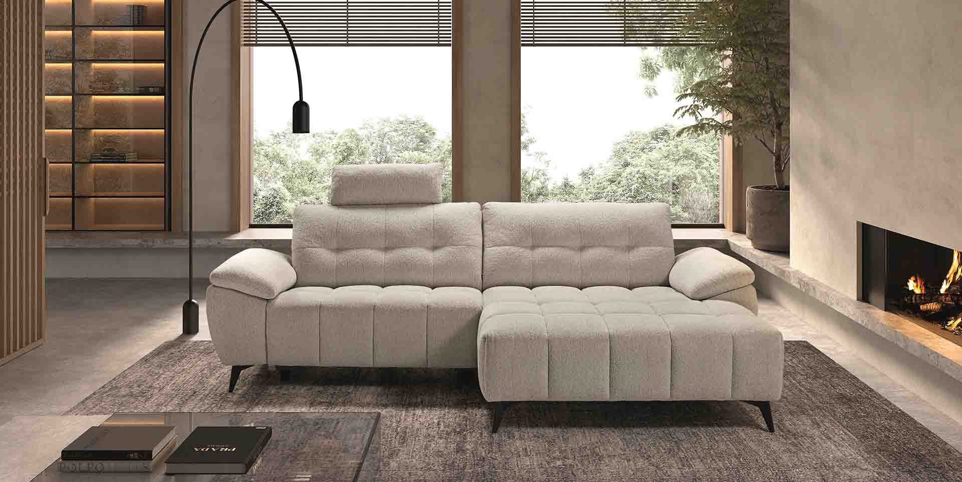 Disponible en deux coloris élégants de tissu, ce canapé d’angle chaise longue s’adapte subtilement à votre décoration pour un intérieur chaleureux, chic et résolument moderne.