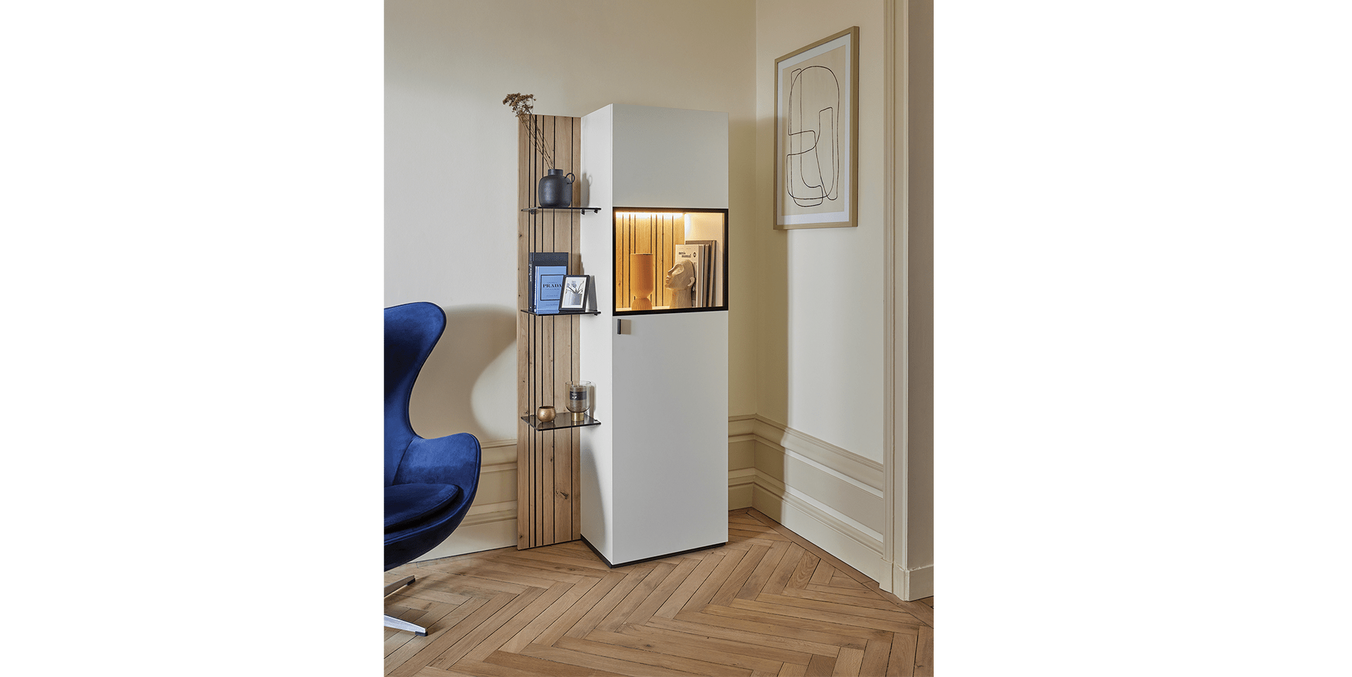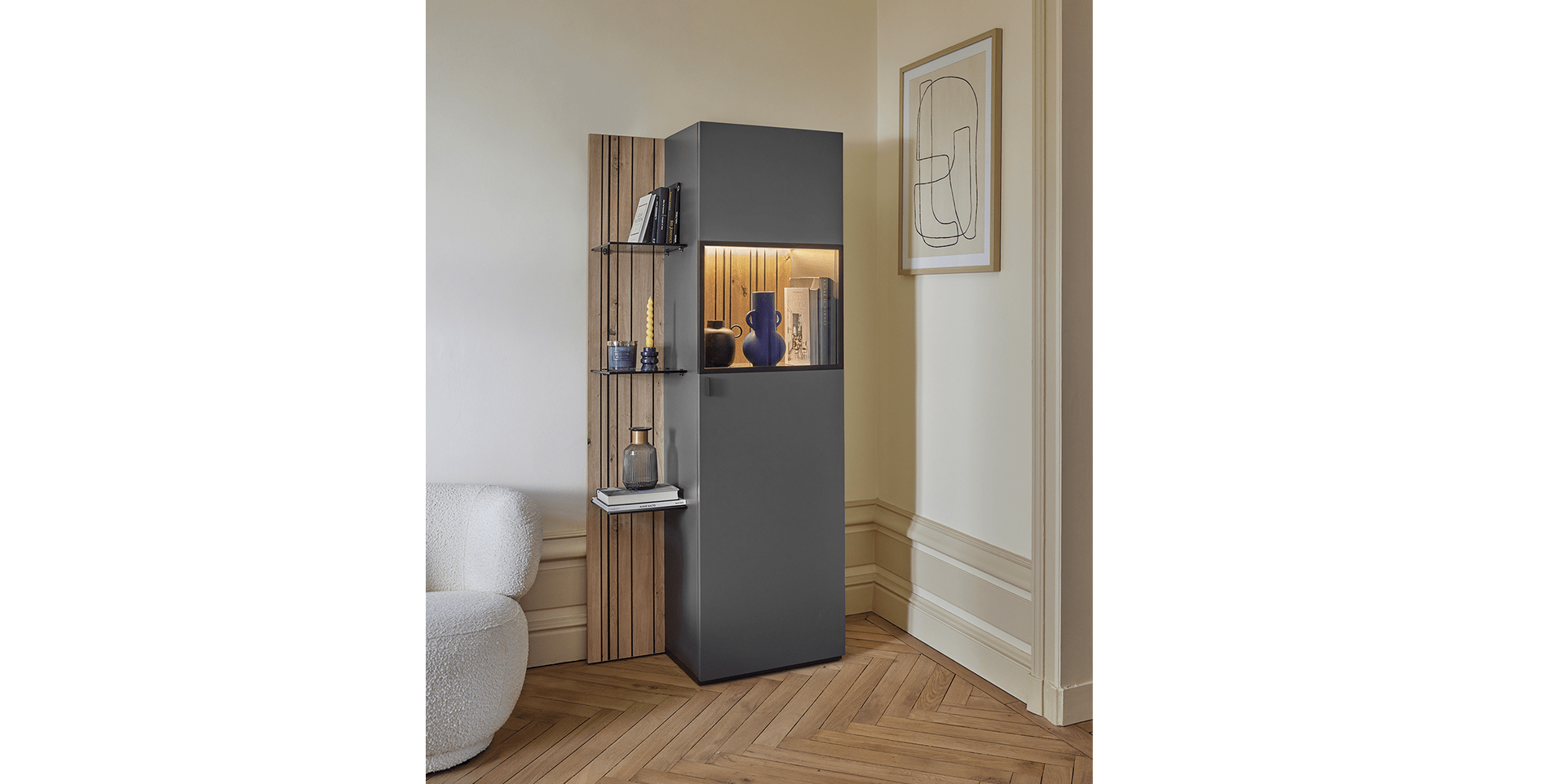 Imaginez la beauté de vos objets préférés exposés dans la colonne vitrine où le fond présente 2 teintes ; chêne doré rainuré en partie vitrine et chêne doré derrière les portes.