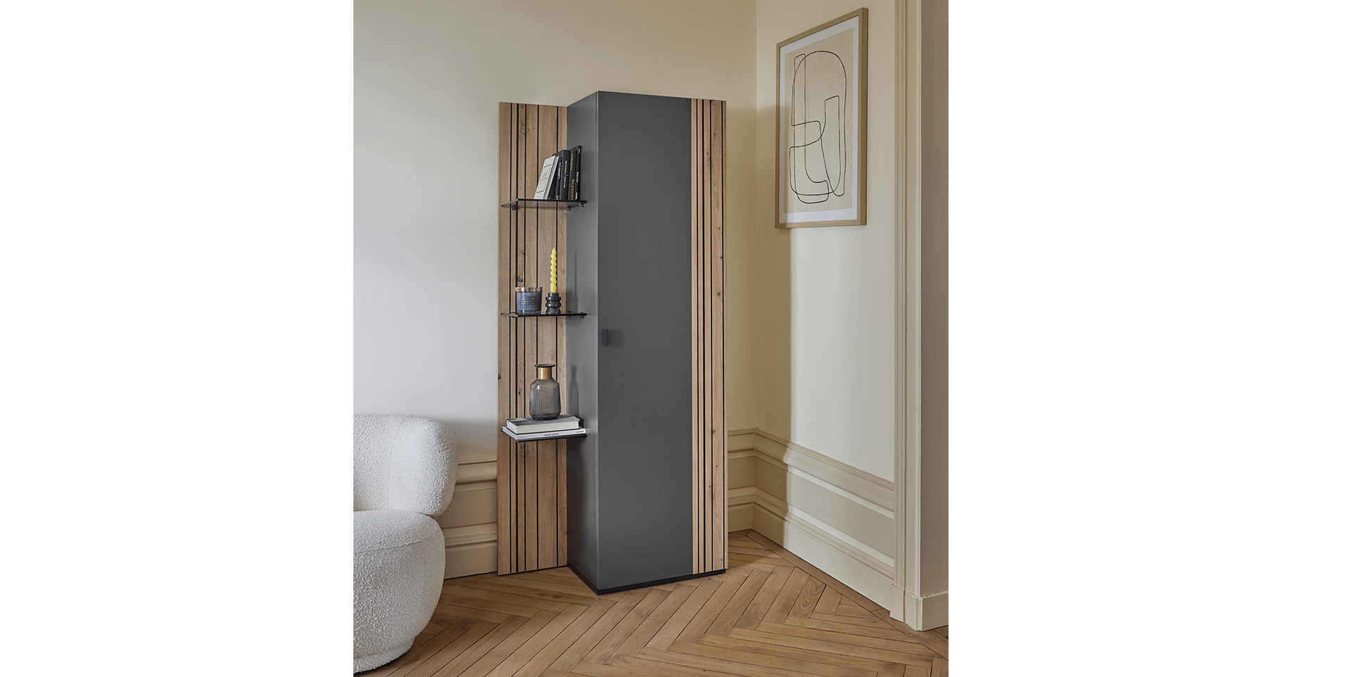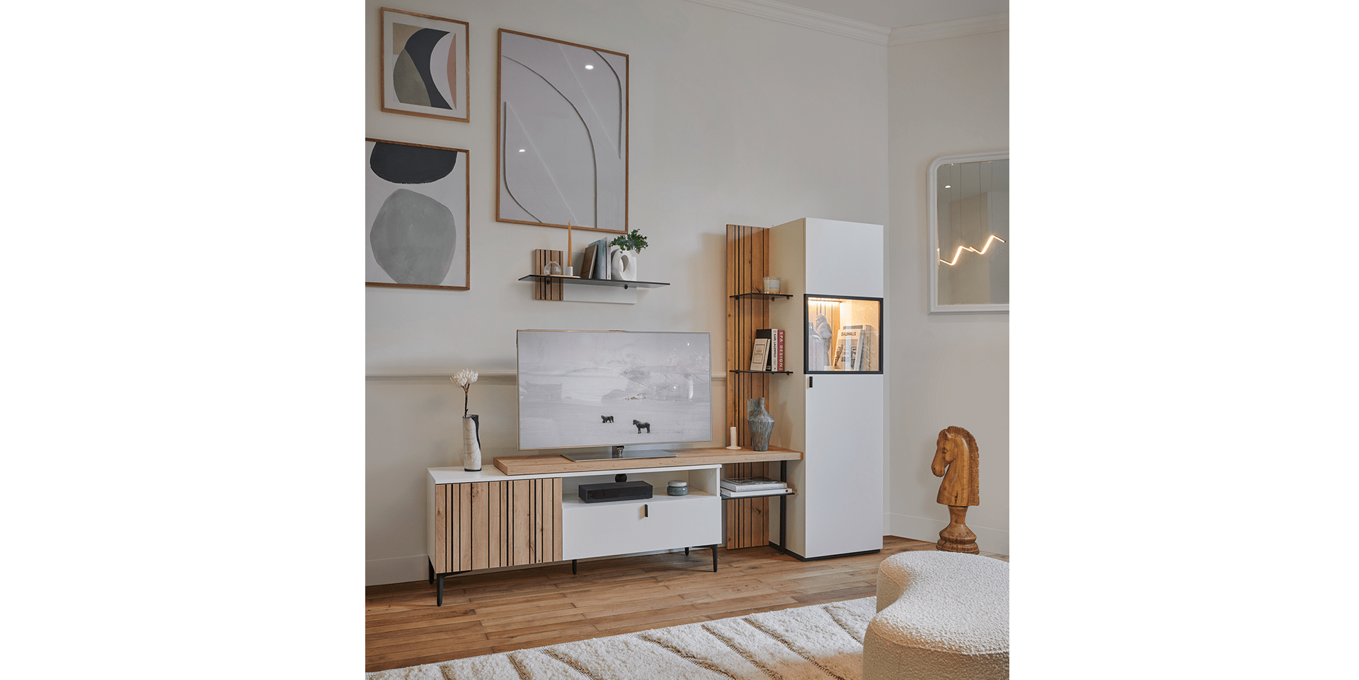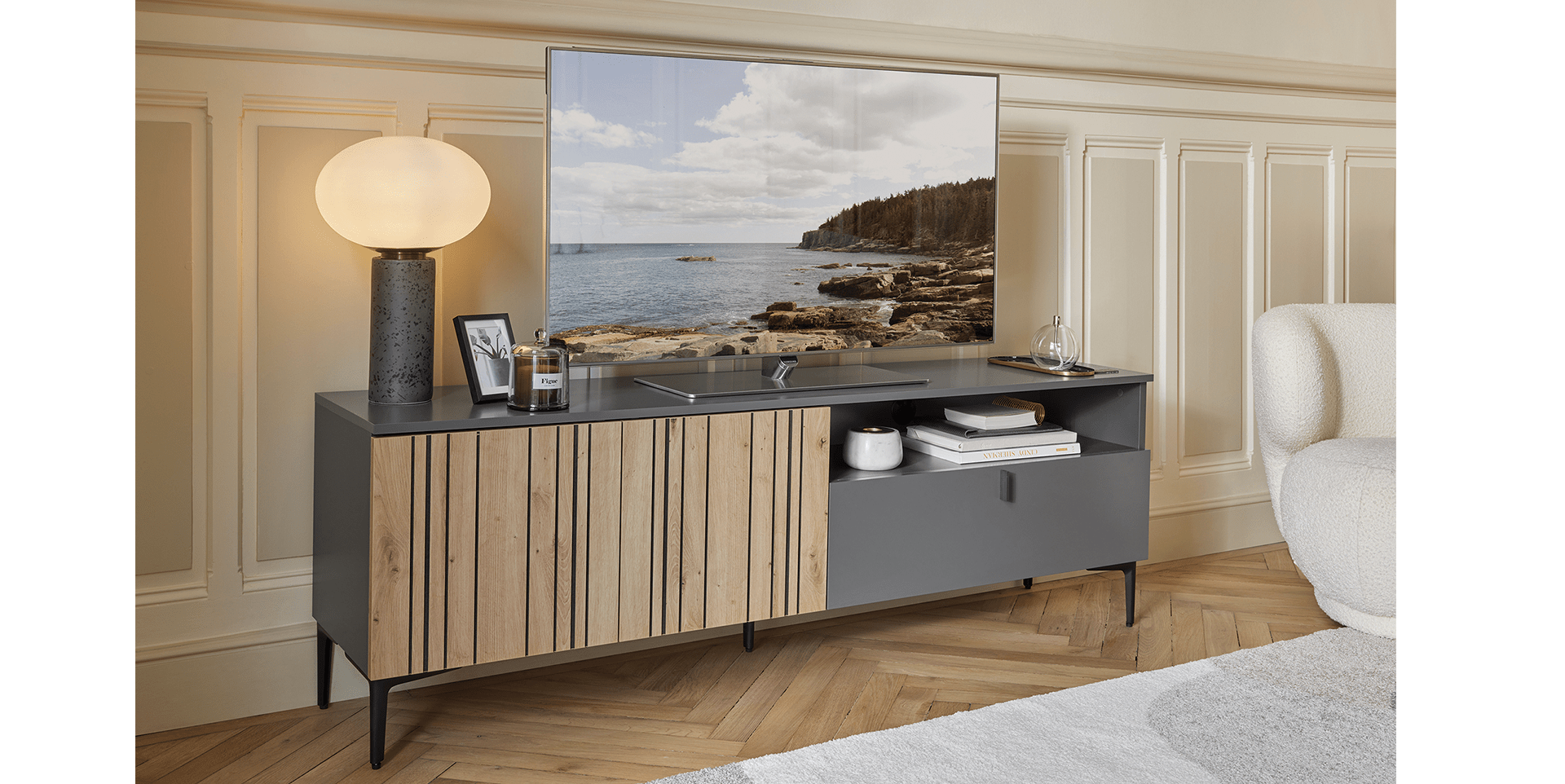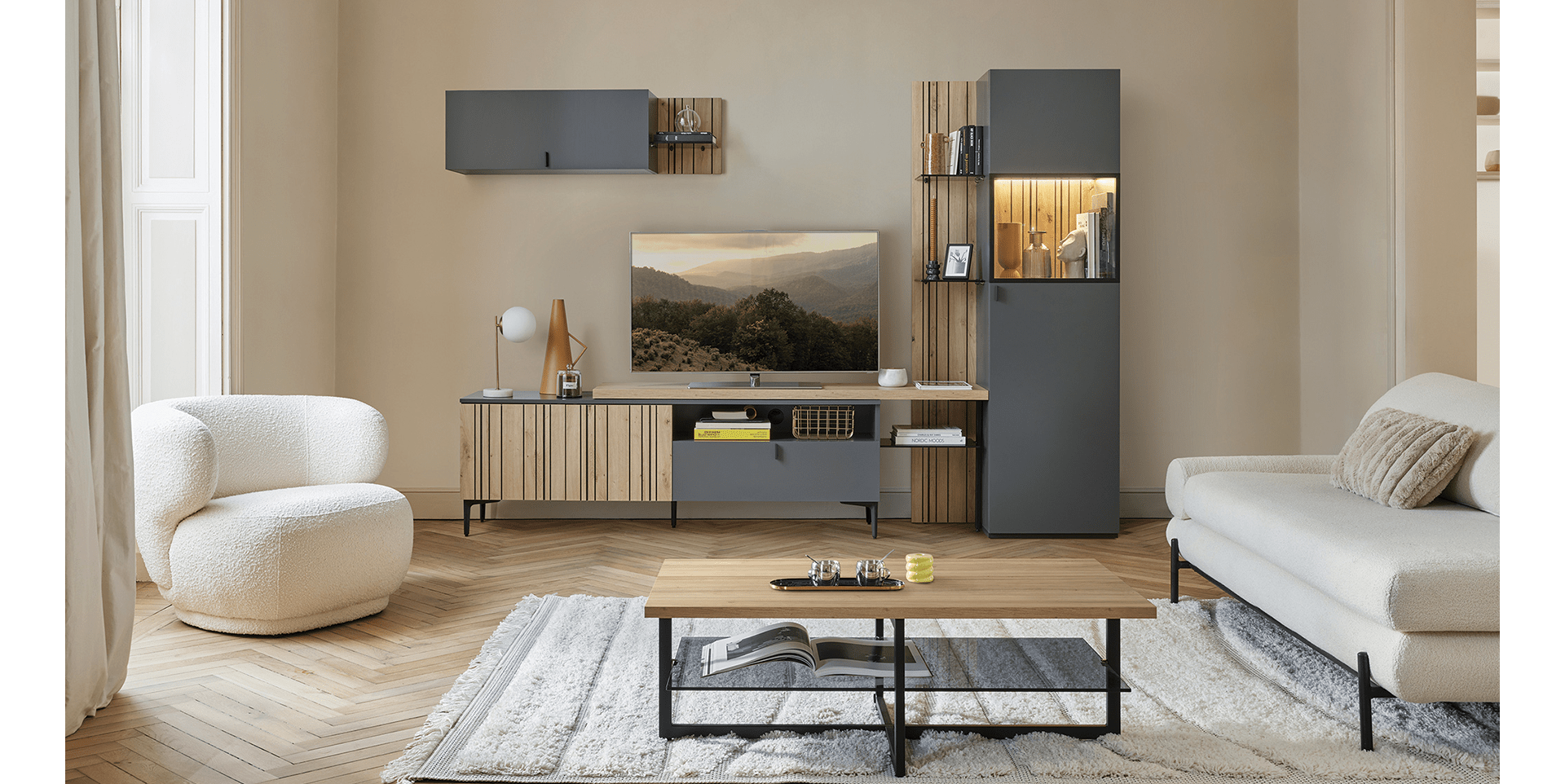 Ce meuble TV extensible TOPAZE allie l’esthétique moderne et la fonction rangement. Il deviendra un point fort de votre salon. Selon le modèle choisi, sa base peut comporter selon la longueur choisie une porte battante simple ou double en chêne doré rainuré, un abattant laqué craie ou carbone, ainsi qu’une niche, tandis que le sur-meuble chêne doré comporte une étagère en verre fumé qui glisse à l’intérieur du meuble.